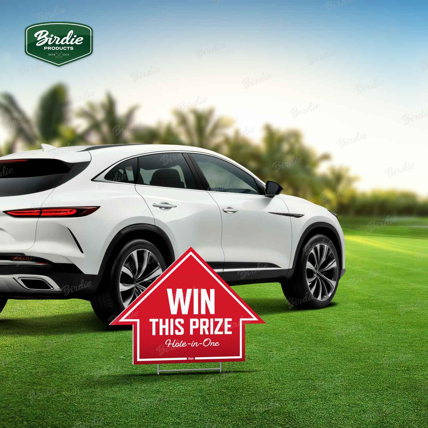 Birdie’s diecut arrow signs are cut to shape making them stand out amongst other forms of signage. Constructed of 4mm Coroplast, these arrow signs include a wire H-stake and make a visual aid for hole-in-one contests and special prize holes.