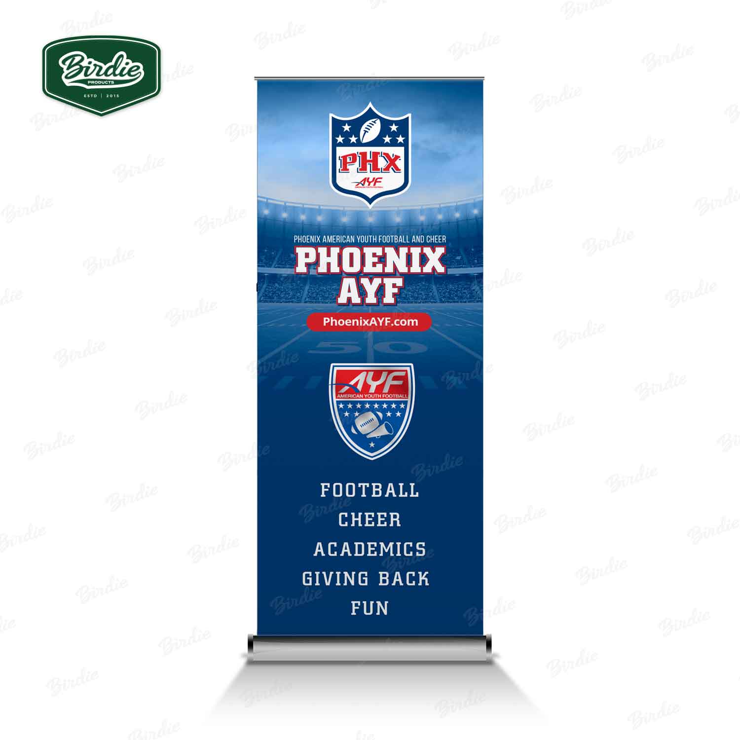 Birdie Media's 33.5”x80” adjustable height premium retractable banner stand is durable and lightweight making it portable and easy to move. These sturdy aluminum banner stands are well-constructed and built to last for years. The banner material is made up of ultra-smooth lay-flat PET (polyethylene terephthalate – a type of polyester plastic) which is ideal for full color printing and vivid color reproduction.